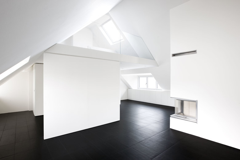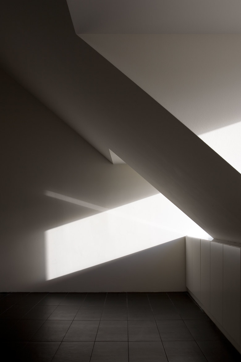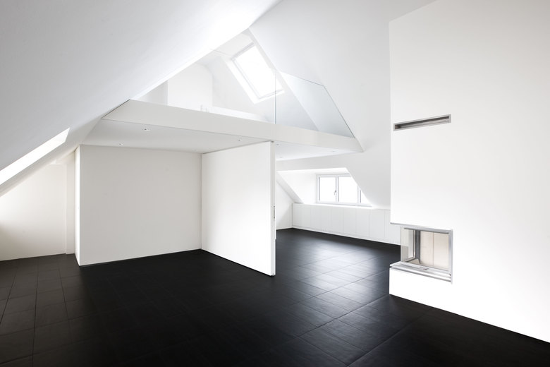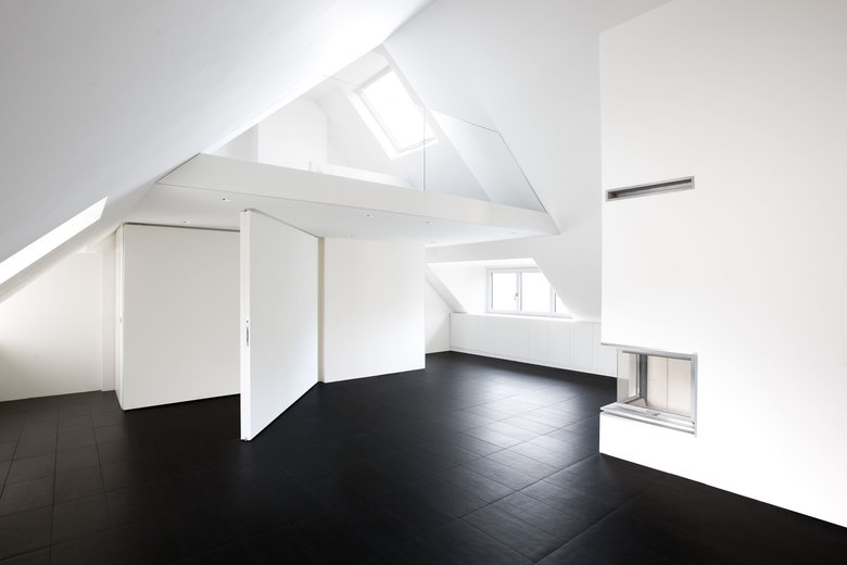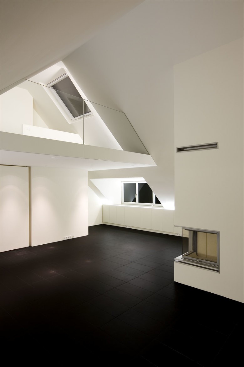 Das Äußere dieses Hauses von 1889 steht unter Denkmalschutz. Für den Bau der Penthouse-Wohnung wurden die bestehenden Innenwände im Dachgeschoss komplett entfernt und ein A-förmiger Stahlrahmen anstelle der bestehenden Tragstruktur eingesetzt. Der so geschaffene stützenfreie zweigeschossige Raum wird durch eine eingestellte Plattform über dem Schlafbereich gegliedert und kann über drei großformatige Faltwände variabel unterteilt werden.