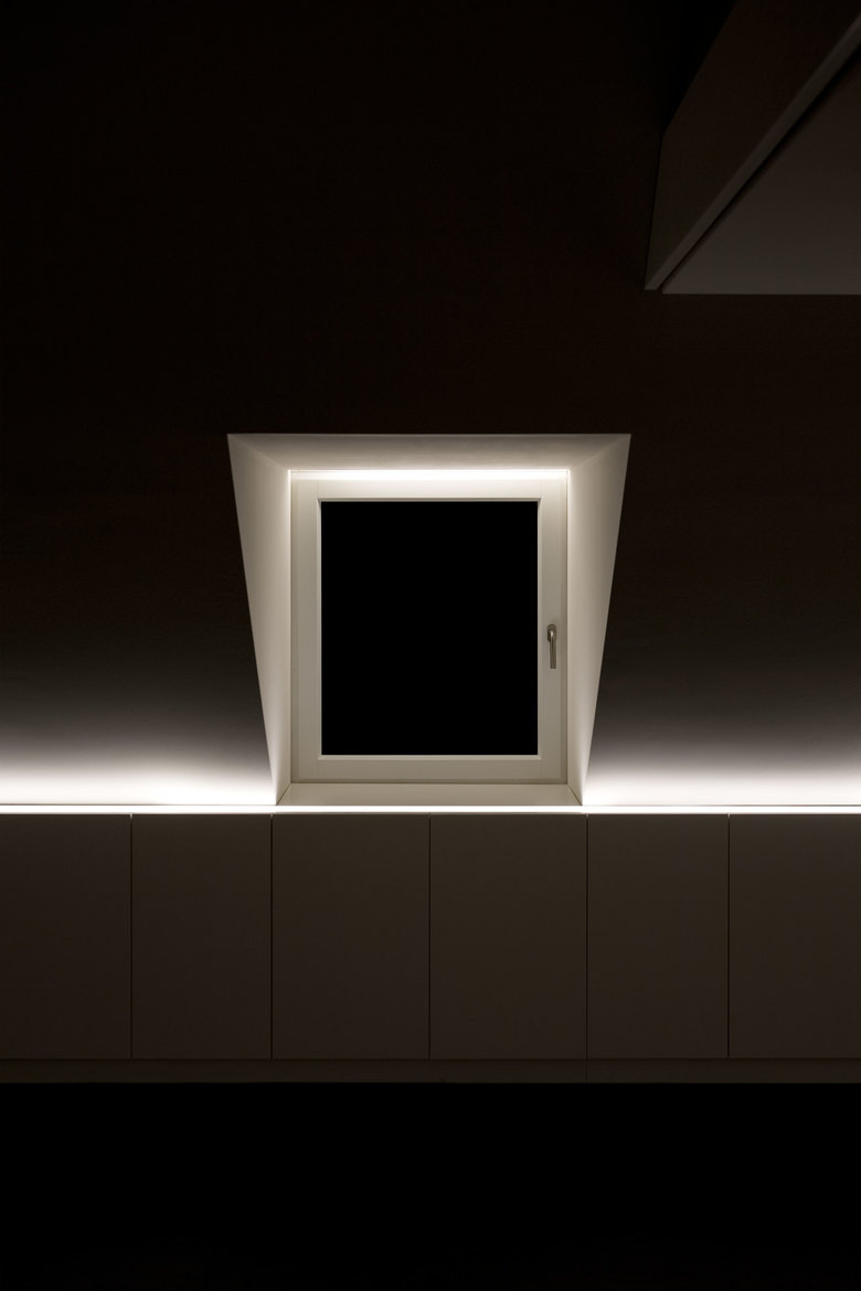 Maßgefertigte indirekte Leuchten in Schrank und Fensterlaibungen gewährleisten die künstliche Belichtung, für die insgesamt 14 eigens für das Penthouse programmierte Belichtungsvarianten zur Verfügung stehen.