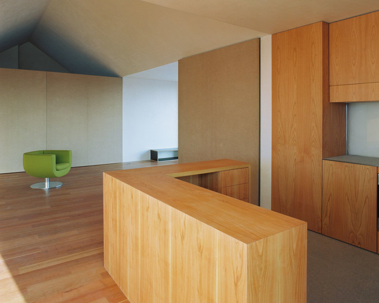 Der durchgehende Bodenbelag unterstützt den Eindruck des räumlichen Kontinuums, wobei durch die Falt- und Klappelemente auch intimere Bereiche geschaffen werden können.