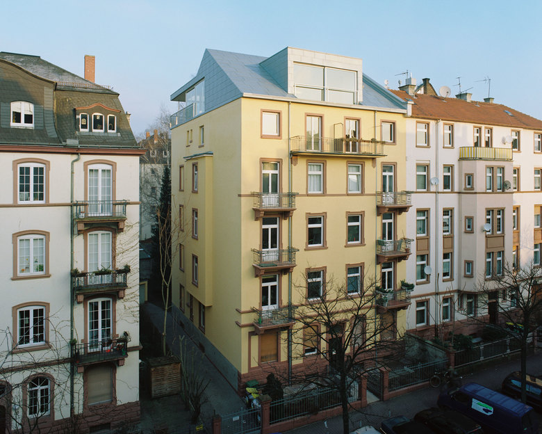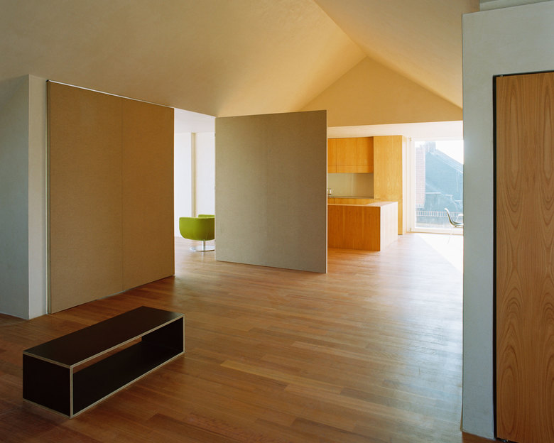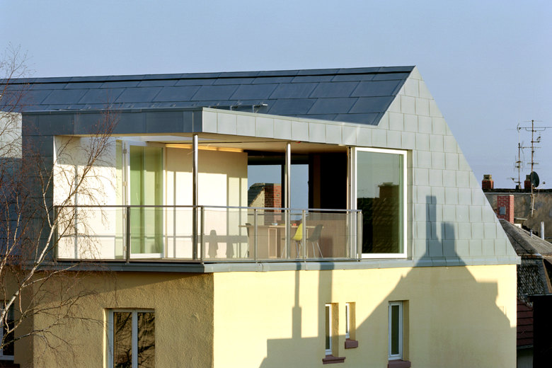 Das Penthouse wurde auf einer bestehenden fünfgeschossigen Wohnbebauung von 1896 errichtet, welche saniert und soweit möglich in ihren Originalzustand zurückversetzt wurde. Das Penthouse ist mit einer Titanium Zinkblech Dachdeckung ausgeführt - eine abstrahierte Referenz an die mit Schiefer gedeckte Nachbarbebauung.