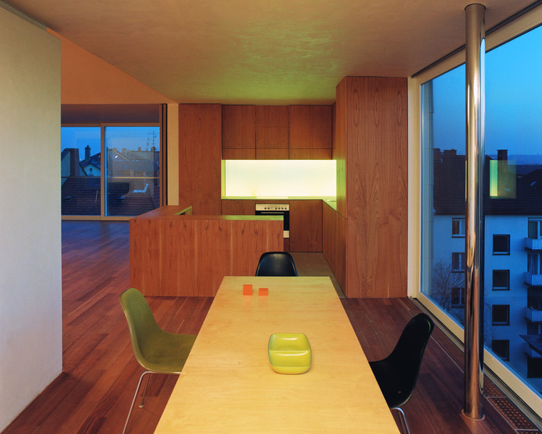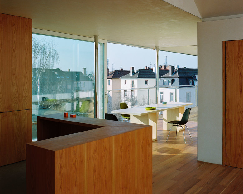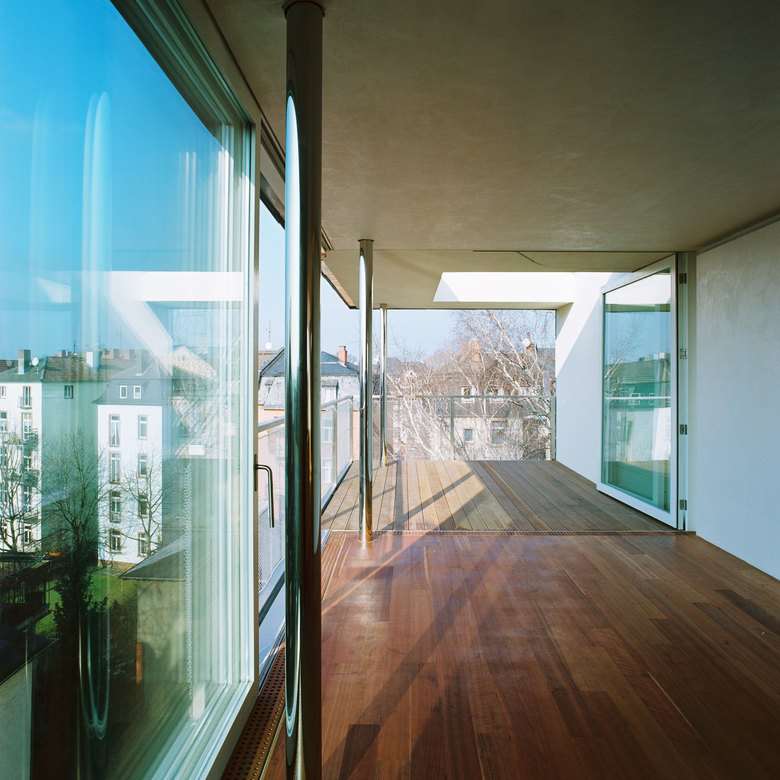 Der Entwurf der Wohnung ist von den Ausblicken auf die Frankfurter Skyline bestimmt. Der Verlauf des Sonnenlichts zu den unterschiedlichen Tageszeiten definiert die Orientierung der einzelnen Räume: so scheint das Licht in den Morgenstunden direkt in den Wohnraum, während es spätnachmittags die Terrasse und den Essbereich beleuchtet. Zentrales Merkmal des Penthouses ist, dass die Grenzen zwischen innen und außen nicht wahrnehmbar sind. Dies wurde durch speziell entwickelte, großformatige Schiebe- und Faltfenster erreicht, die sich über die gesamte Breite der Öffnung klappen und schieben lassen.