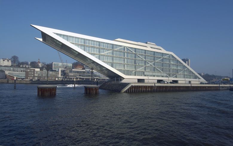 Bauen in der Elbe. 400 m Spundwand wurden eingebaut und 30.000 m³ Erde bewegt, um neuen Baugrund zu schaffen für das eindrucksvolle Gebäude mit dem bezeichnenden Namen. Das “Dockland” erstrahlt hier als Perle in der Gebäudekette am nördlichen Elbufer. Besucher können - entweder zu Fuß über die Treppenanlage oder auch bequem durch zwei Schrägaufzüge befördert - auf einer Plattform 35 m über der Elbe ein Ozeandampfer-Feeling erleben. Die äußerste, weit in die Elbe reichende westliche Spitze ist jedoch nur den Mietern zugänglich.