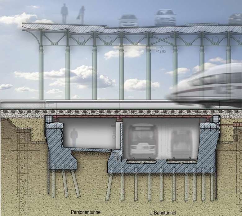 Der Hamburger Hauptbahnhof ist der Verkehrsknotenpunkt in Norddeutschland. Hier werden nicht nur die Hauptstrecken der Bahn gebündelt, es kreuzen sich auch alle anderen innerstädtischen Verkehrsströme. Mitten im Hauptbahnhof befinden sich die Gleisbrücken der Bahn, die nach über 100- jähriger Betriebszeit erneuert werden mussten. Drei Verkehrswege haben hier eine gemeinsame Schnittstelle: Unterhalb der Gleisbrücken verlaufen die Gleise der U-Bahnlinie U3, darüber führen die Gleise der Bahn, und oberhalb der Bahngleise verläuft der Straßenverkehr auf der vierspurigen Steintorbrücke. Die anspruchsvolle Aufgabe bestand darin, die Gleisbrücken auszutauschen, ohne die Verkehre einzuschränken. Hierzu wurde die neue Konstruktion so optimiert, dass die Auswechslung der Brücken in nur zwei 48 Stunden Sperrpausen erfolgen konnte. Alle Arbeiten zur Sanierung und Ertüchtigung der Widerlager und zur Schaffung eines neuen Mittelauflagers erfolgten zwischen diesen Sperrpausen "unter rollendem Rad". Die Bahnsteige blieben während dieser Zeit voll funktionstüchtig, so dass der Reisende fast nichts davon bemerkt hat, dass die Gleisbrücken nun wieder fit sind für die nächsten 100 Jahre ...