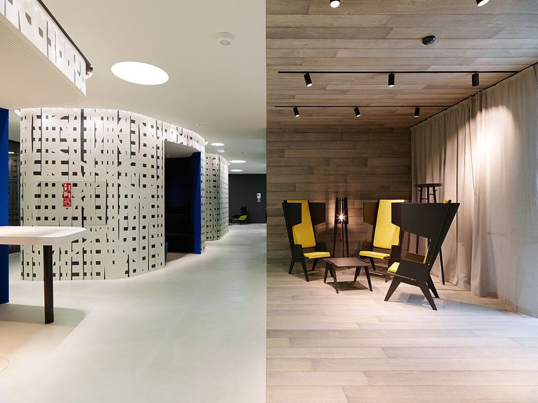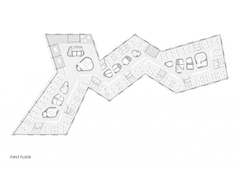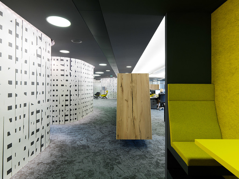 Besprechungs- und Rückzugsräume, Telefonboxen und Sitznischen zonieren den Großraum und schaffen so eine Abfolge von halb offenen Gruppenbüros.