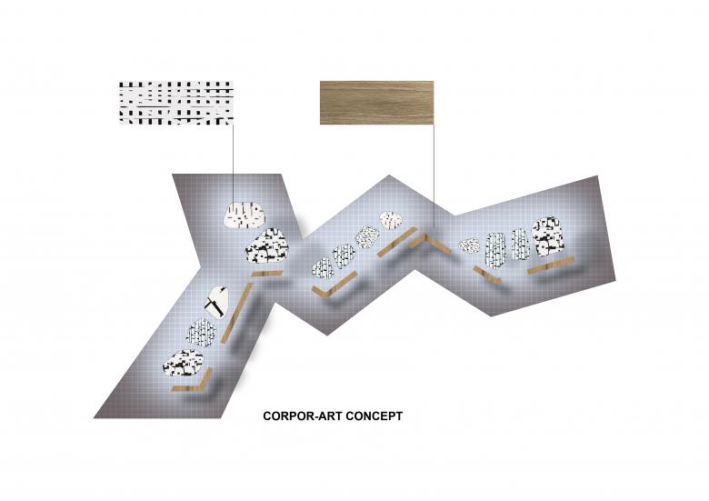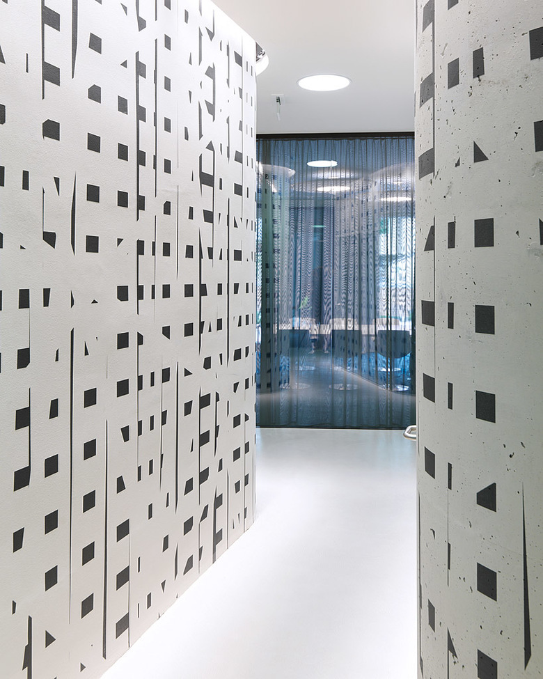 Zum anderen die zentralen „Kerne“, die von der Künstlerin Esther Stocker mit Wall Works „getarnt“ eine durchgängige 4-geschossige Raumskulptur bilden und als zweites Element stark identitätsstiftend sind.