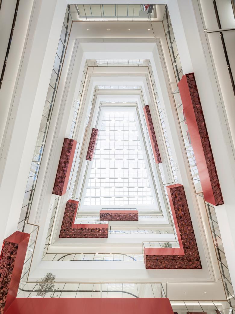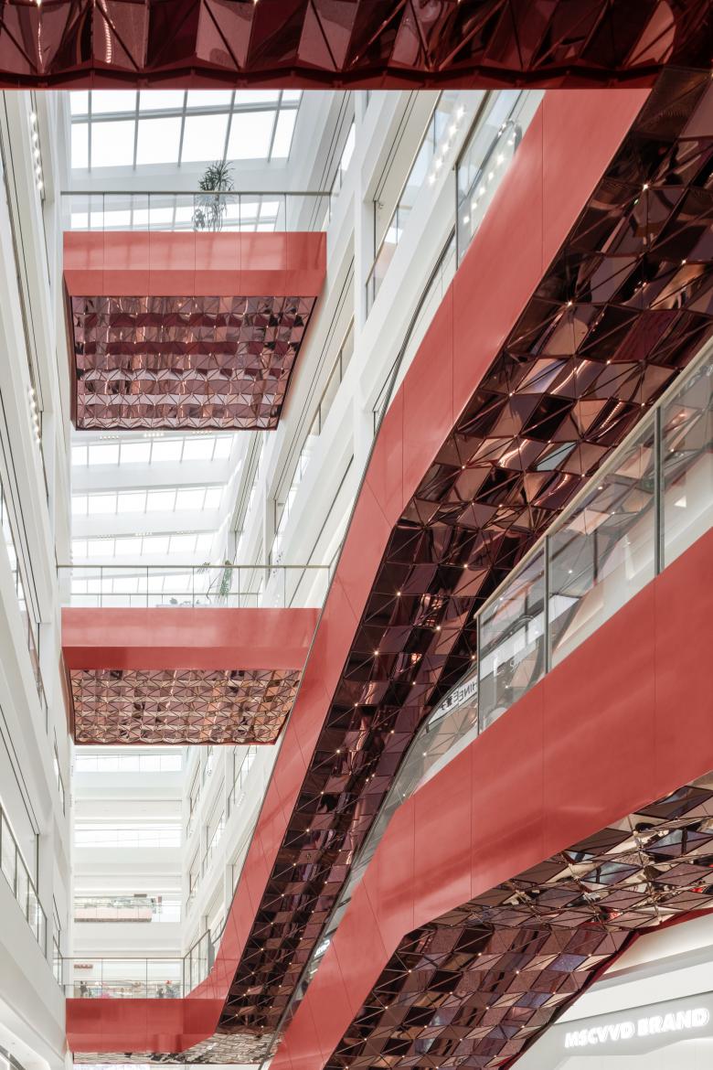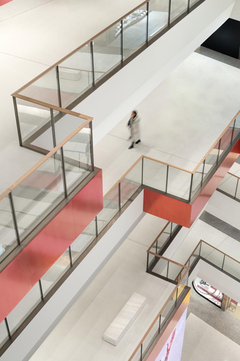 Um den Besuchenden die Orientierung auf der weitläufigen Fläche von 70.500 Quadratmetern zu erleichtern, sind die drei Atrien, die das Einkaufszentrum erschließen, unterschiedlich gestaltet. Allen gemein ist zwar das neutrale Weiß der Architektur, das jedoch durch das leuchtende Rot der raumgreifenden Auf- und Abgänge individuell kontrastiert wird und durch die jeweilige Inszenierung verschiedene merkfähige Räume entstehen.