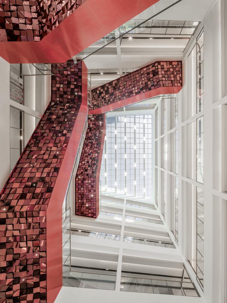 Im westlichen Atrium lenkt die installative Anordnung der Rolltreppen den Blick direkt nach oben: Wie die Äste eines Baumes verzweigen sich die Zugänge in die jeweiligen Geschosse und referenzieren mit ihren quadratischen Metallplättchen auf die gepflasterten Pfade am Seeufer und in den historischen Gassen.