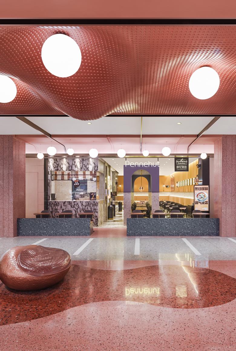 Neben den großzügigen Atrien sind in der Wuxi MixC Mall eine Reihe weiterer öffentlicher Plätze entstanden, die soziale Interaktion und kollektive Erlebnisse fördern. Einer der wichtigsten und größten ist etwa der Food Court „Yummy“ im Untergeschoss, der nicht nur gastronomische Vielfalt, sondern auch die Möglichkeit zum persönlichen Austausch bietet: In einem zentralen Bereich, der von einer markanten Deckeninstallation – einer spielerischen Adaption des roten Leitmotivs – gefasst ist, stehen den Gästen zum Teil begrünte Sitzinseln zur Verfügung, die jeweils an den Seiten durch zusätzliche Sitzgelegenheiten zum gemeinsamen Essen und Verweilen ergänzt werden.