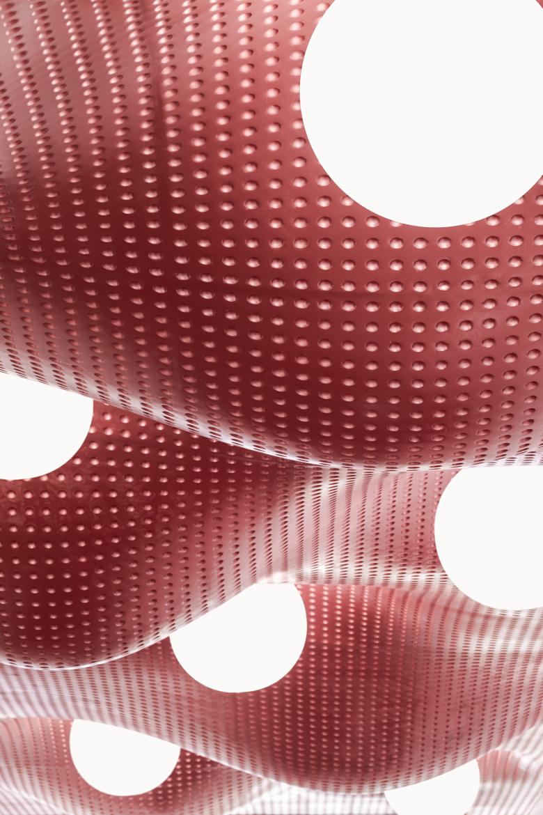 Auch das zentrale Atrium, das ebenfalls von oben belichtet wird, ist von den heimischen Gewässern inspiriert, auf deren Oberflächen sich das Sonnenlicht kaleidoskopartig bricht. In diesem Bereich konzentrieren sich die roten Elemente auf die Balkone, die mit ihren Sitzgelegenheiten und abwechslungsreicher Bepflanzung zu Orten der Begegnung werden. Sie sind mit dreieckigen Metallfragmenten gestaltet, die von unten betrachtet ein dynamisches Spiel an reflektierenden Kubaturen ergeben. Ein integriertes, großformatiges Display dient hier zudem als Infoscreen, aber auch als Kulisse für größere Veranstaltungen, die in regelmäßigen Abständen im Hauptatrium stattfinden. Wie auf einem Marktplatz verändert sich so das Erscheinungsbild des Raums ständig und es entsteht ein flexibler Ort, der je nach Anlass und Bedarf angepasst werden kann.