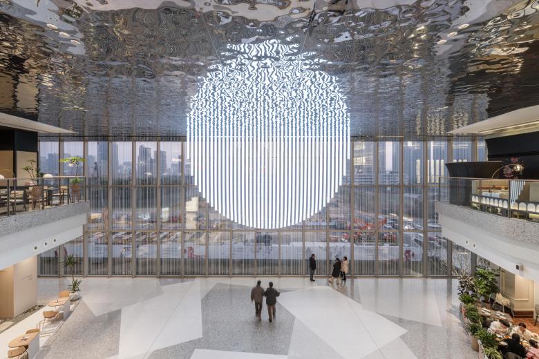 Aber auch in den oberen Etagen sind Begegnung und Kommunikation Teil des offenen Raumkonzepts: Mit dem zweigeschossigen „Moon Garden“ ist ein äußerst dynamischer Event Space entstanden, der von weiteren Restaurants gerahmt wird und in dem Live-Musik, Ausstellungen und andere attraktive Veranstaltungen in kleinerem Umfang stattfinden können. Besonders prägend ist dabei auch hier die Deckengestaltung: Vor der Fassade spiegelt sich eine großformatige, halbrunde Lichtskulptur in einer metallisch reflektierenden Oberfläche wie der leuchtende Mond im Wasser. Und auch die polygonalen, verspiegelten Stützen, die wie farbig schimmernde Kristalle in die Höhe ragen, setzen sich in der gewellten Edelstahldecke ins scheinbar Unendliche fort.