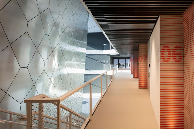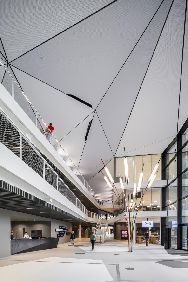 Interior: Vielfalt in Einheit – Das Interiorkonzept spiegelt die „Vielfalt in Einheit“ wider. Warme Farben und wertige Materialien in der Verwaltung und Farbakzente mit dynamischen Oberflächen in den Sportwelten vermitteln zwischen den Maßstabsunterschieden. Der einheitlich helle Boden auf allen Etagen des Boulevards verbindet die unterschiedlichen Bereiche. Geneigte Wände in verschiedenen Materialien und Farben leiten den Blick weiter, während darüber die gefaltete Decke, eine wie ein Netz aus Knoten und Fugen aufgespannte Dreiecksfläche aus gelochten GK-Feldern, den Gesamtzusammenhang überspannt. Als kontinuierliches Thema verbindet sie all jenes, was das neue Gebäude künftig zusammenführt: Büroarbeit und Bewegung, Spiel und modernste Wissenschaft, nahbare Ausstrahlung und beschützenden Raum. Die durchlaufenden Geschossbänder bilden zusätzlich ein begleitendes Element und prägen das Haus - innen wie außen.