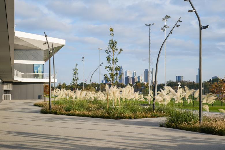 Waldcampus – Eingebettet in eine gewachsene, urbane Grünstruktur liegen die großen und kleinen Freiflächen der Sportfelder und Außenbereiche der Akademie wie in einer Lichtung im Stadtwald. Zwischen dem Athletenhaus und den Außensportplätzen spannt sich ein hochwertiger Aufenthaltsbereich auf, welcher in einer Sitzstufenanlage für Sportler:innen und Besucher:innen abschließt. Einzelne Grünflächen mit schattenspendenden Gehölzen, Gräserpflanzungen und Sitzmöglichkeiten schaffen eine angenehme und freundliche Aufenthaltsatmosphäre.