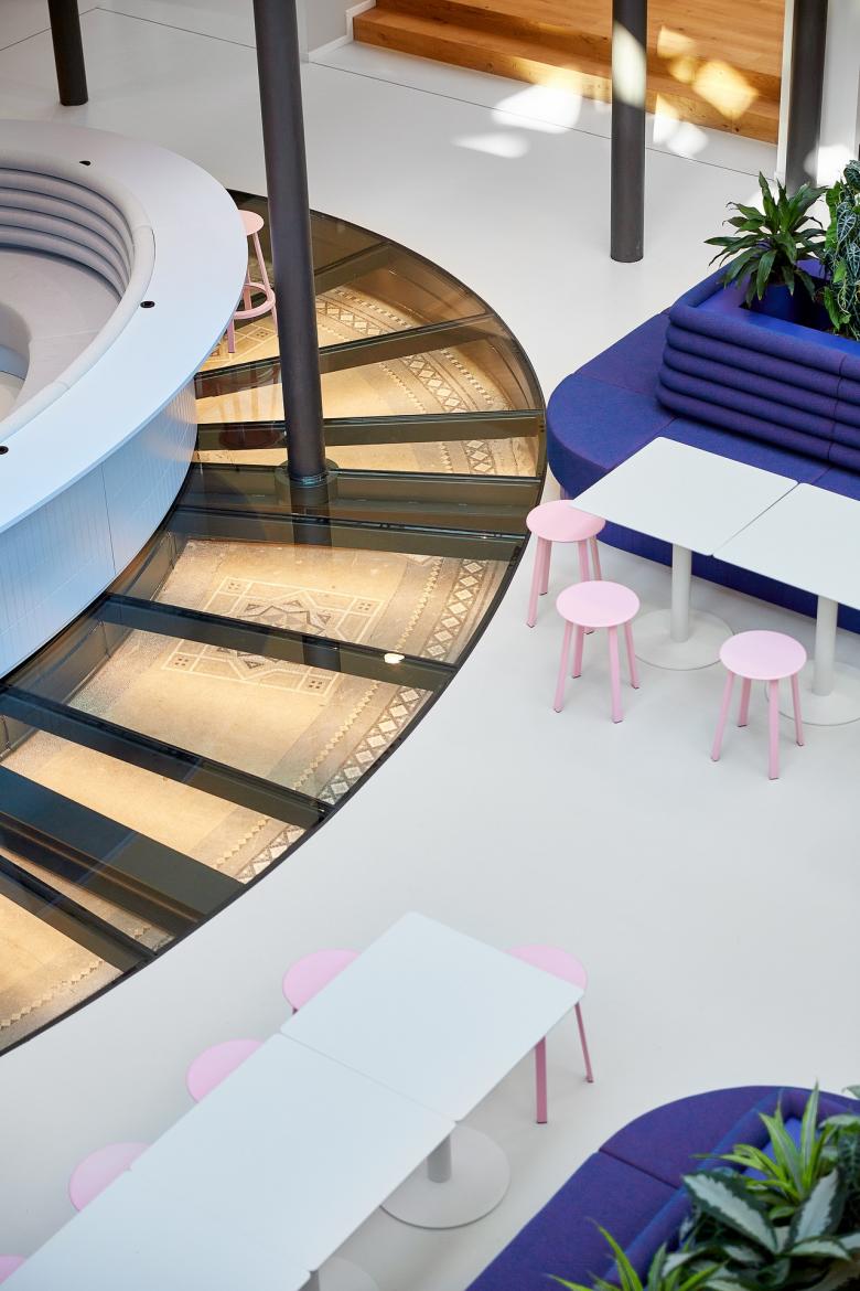 Ein großzügiges Raumkonzept über drei Etagen dient nun als Heimat für die individuellen Bedürfnisse der Teams und schafft einen gemeinsamen Erlebnisraum. Die von Kinzo gestalteten Räume im Hauptgebäude werden durch einen neuen L-förmigen Anbau von Graft ergänzt. Kinzo stand vor der spannenden Herausforderung, einen historisch bedeutsamen Standort in der Friedrichsstraße mit einem Unternehmen zu verbinden, das symbolisch für die aktuelle Entwicklung Berlins steht. In Abstimmung mit der Denkmalschutzbehörde wurde die historische Raumaufteilung als Vorlage für den Grundriss der neuen Büros genutzt.