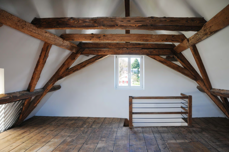 Das zweite Obergeschoss wurde mit dem Estrich zu einer Maisonettewohnung umfunktioniert. Diese beinhaltet zwei Zimmer, eine Essküche mit Loggia und eine Dusche. Unter dem Dach befindet sich ein grosser Wohnraum.