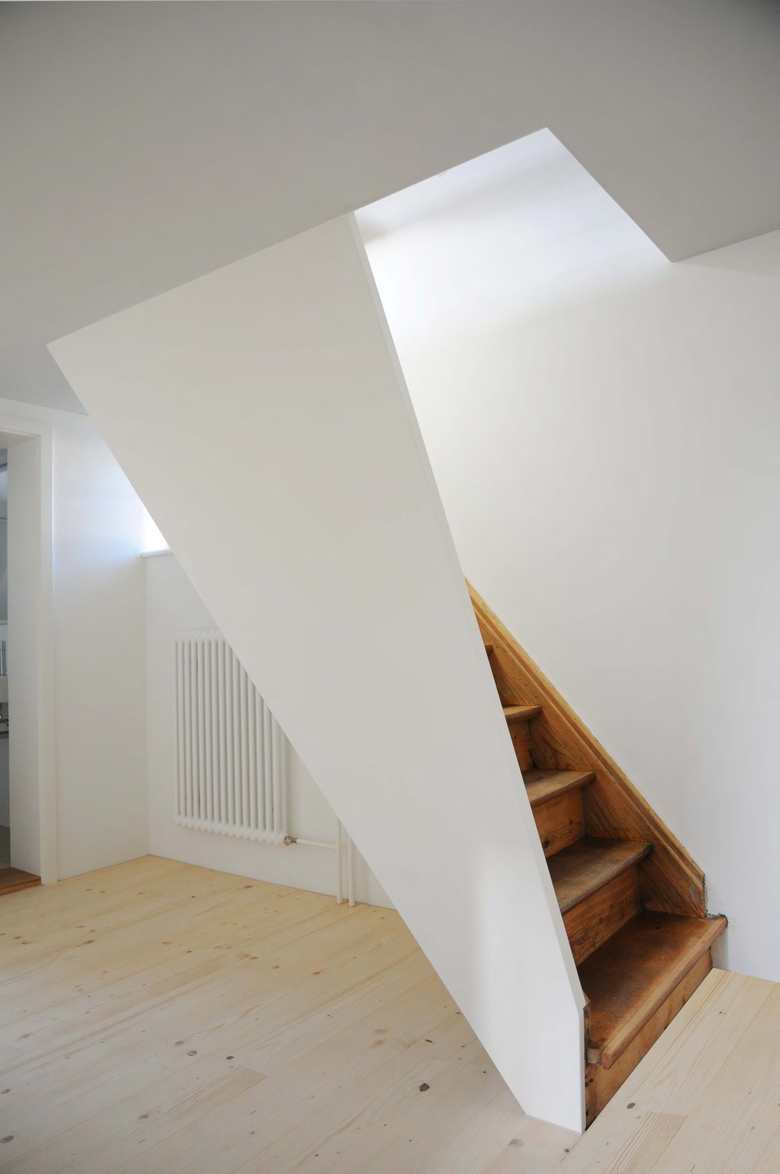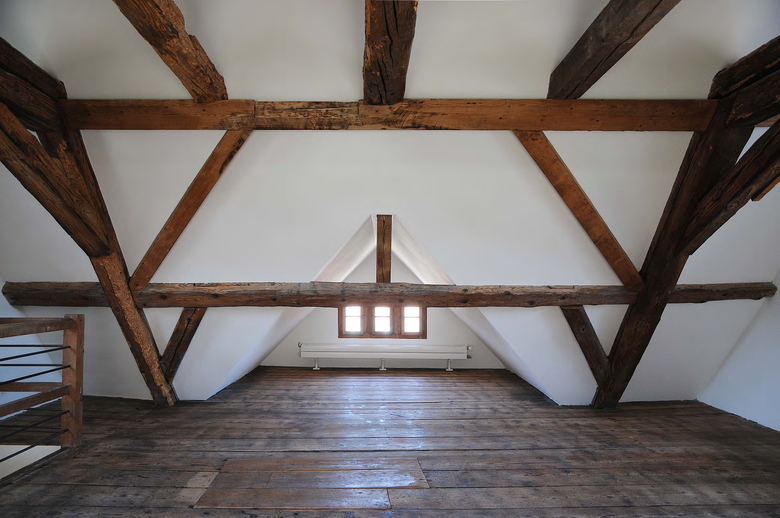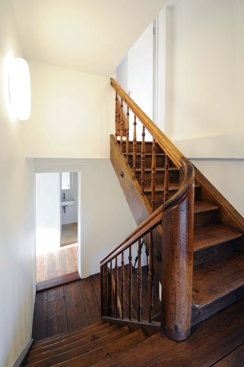 Das Treppenhaus, die Treppe ins Dachgeschoss sowie die Holzkonstruktion des Daches sind original erhalten.