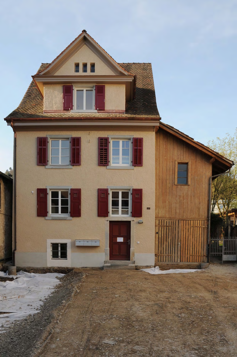 Was heute die Westfassade des Hauses darstellt, war früher die Trennwand zwischen Scheune und Wohnteil. Sie besitzt nur wenige Öffnungen. Die Scheune wurde Anfang des 20. Jahrhunderts abgerissen und durch einen Holzschopf ersetzt. Zu dieser Zeit wurde der ehemalige Wohnteil aufgestockt und auf jedem Stockwerk eine Dreizimmerwohnung eingebaut.