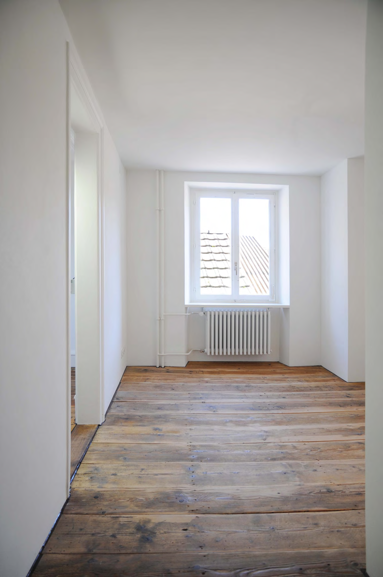 Das zweite Obergeschoss wurde mit einem neuen Tannenparkett versehen, im Bad ist wie in allen Bädern der Liestaler Kalkstein eingesetzt worden.