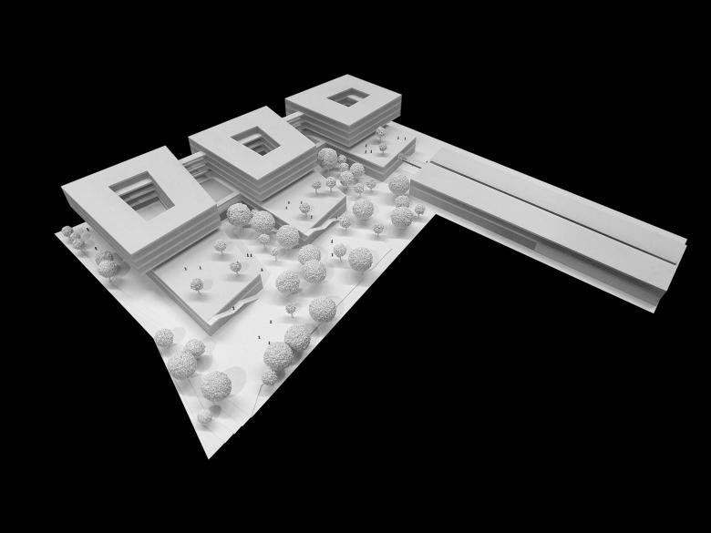 Die Größe der Schule wird durch die architektonische Ausformung des Gebäudes in einen städtebaulich und pädagogisch sinnvollen Maßstab gebracht. Ein begrünter zweigeschossiger Sockel nimmt die gemeinschaftlichen Funktionen, die Werkstätten und die als „Mall“ ausformulierten Unterrichtsräume für Einzelhandel auf und verzahnt sich mit dem großzügigen Freiraum. Über einem als Fuge ausgebildeten Verwaltungsgeschoss sitzen drei Baukörper, in welchen sich die EDV-basierten Unterrichtsräume befinden und welche die Maßstäblichkeit der Seestadt aufnehmen.