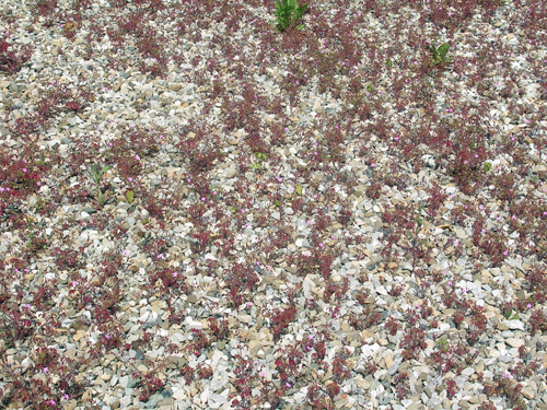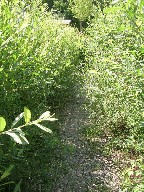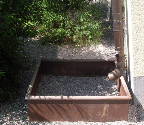 Die Spielgeräte liegen randlich zu der zentralen Spielwiese und den labyrithartigen Heckenstrukturen aus Hainbuche und Weide. Das Dachwasser der Gebäude wird in großen Töpfen aus rostendem Stahlblech aufgefangen und dann versickert.