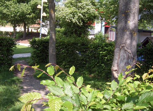 Durch den Anbau einer Ballsporthalle wurde die Neuanlage des Außenbereiches für den Kindergarten im Freizeitheim notwendig. Die bestehenden Freiräume um das Gebäude sind mit geschnittenen Hainbuchenhecken gegliedert und abgegrenzt; aus diesem Grund waren diese Hecken auch bei der Neuanlage ein wichtiges Element.
