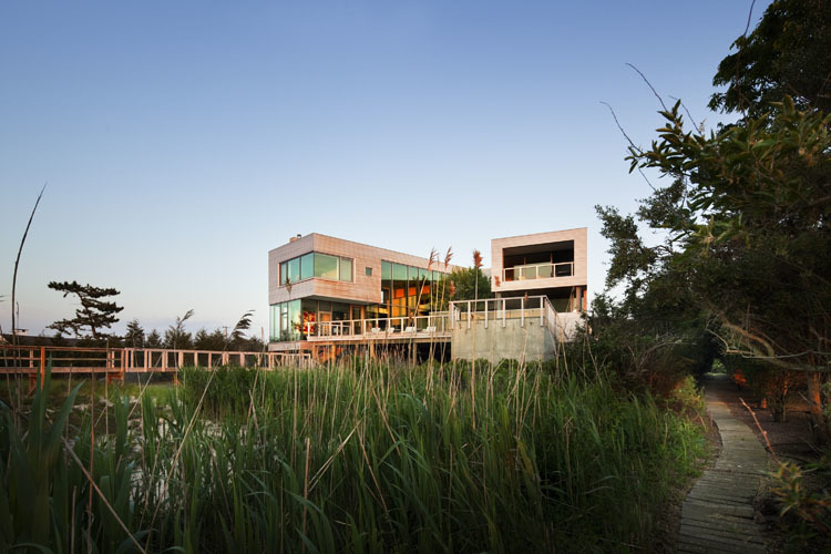 Situated in a flood plain on the barrier island off of Long Island, this house is elevated on piles, allowing the beach landscape to run through the site. A wood boardwalk, running the length of the site from the entry road out to the rear yard boat dock, splits the house, providing dramatic views of the bay and marsh grasses. The house's massing is a composition of solid and void, with solid walls to the ground and others on piles left exposed.