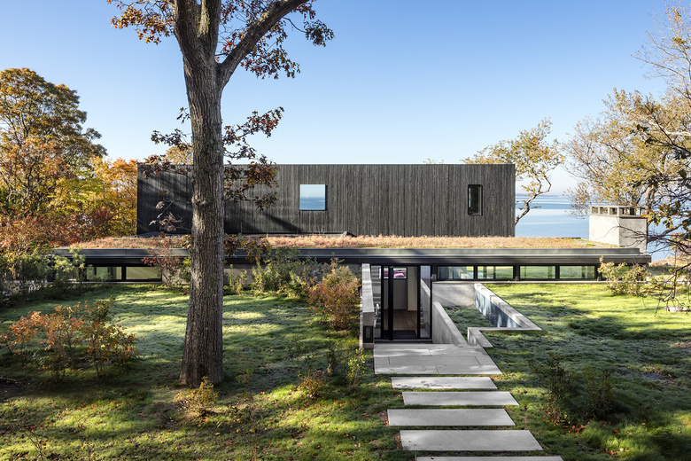 From afar, the house is an abstract cedar-clad facade, the wood charred to match the color of surrounding tree bark. However, upon approach a cut in the earth clearly provides entry to a glass-enclosed court with sweeping water views.