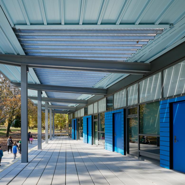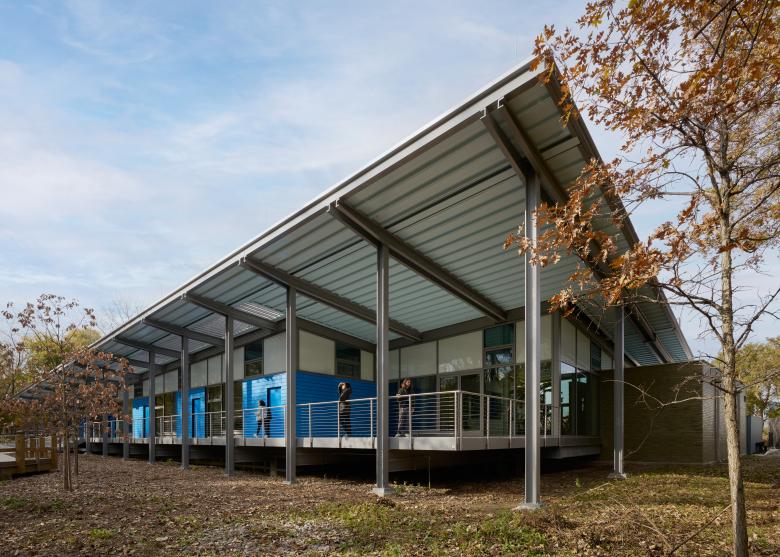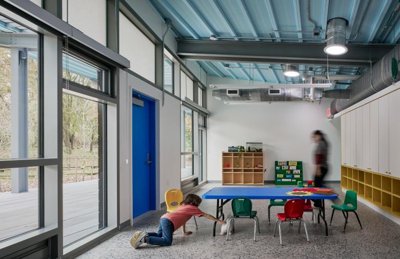 In addition to targeting LEED Gold certification, the building doubles as a teaching tool that highlights sustainable building practices. Mechanical and environmental systems are exposed so educators can share the building’s sustainable features with students and visitors: toilets flushed with rainwater, a geothermal system that takes energy from the ground to heat and cool the building, light-diffusing windows and skylights that provide daylighting and natural ventilation. Large windows in the mechanical room further display the building’s inner workings. Comfort and well-being were also primary goals: warm floors create cozy learning spaces, and even daylighting and sound-absorbent ceilings offer a calming environment. In the landscape, native planting in parking lot bioswales cleans rainwater runoff and keeps it from inundating the city sewer.