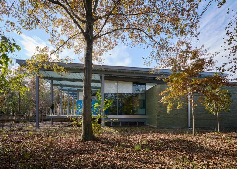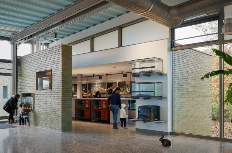 The building maximizes interior and exterior learning space and parking on a very tight site, allowing APEC to expand its capacity. APEC’s famous animal room, traditionally the main attraction, is open to the entry lobby, where the animals welcome visitors directly. Bright and flexible classroom spaces connect students to nature trails and extend outdoors. These classrooms have walls that open to create a single space for events. Exterior classrooms include a sheltered observation deck and stepped seating under the tree canopy.