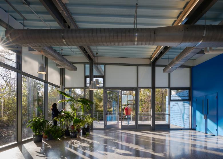 Upon entering the building lobby, visitors can take in a view of the forest. The entry also serves as the launching point for a network of nature trails that allow exploration of Alley Creek, Cattail Pond, and Windmill Pond.