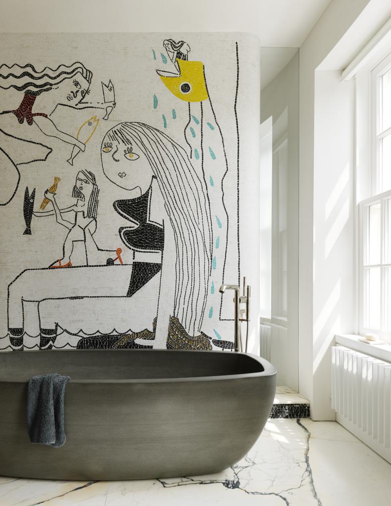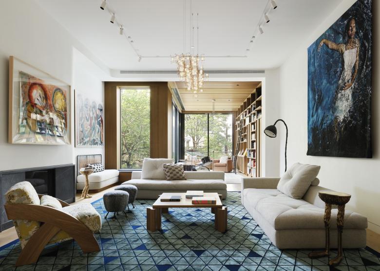 The clients, art collectors with a very diverse collection of emerging artists, wanted the house to have the same youthful and creative energy as their pieces. As architects, builders, and interior designers, we were able to work closely with skilled craftsmen to create bespoke places for art. In addition, select wall space was left empty to allow new art to be installed in a flexible gallery style. One-of-a-kind fabrics and rugs were created to be art pieces in their own right, complementing work by artists including Takashi Murakami, Tracey Emin, Danielle Orchard, Hyegyeong G. Choi, Derek Fordjour, Sanford Biggers, Kehinde Wiley, and Summer Wheat.