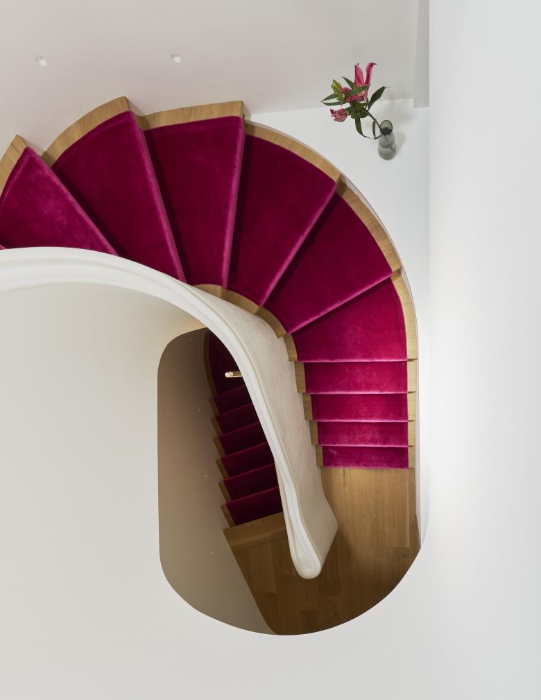 By removing floor area in the rear of building, two nearly double-height levels were fashioned, resulting in spaces that are larger in scale and take full advantage of garden views. Planters and green roofs terrace up the rear facade, creating the sense of living in the garden at every floor. The shifted floor plates also make for an unexpected navigation path through the residence, designed in part to showcase a vast and eclectic art collection. The focal point is a sculptural stair that spirals up through shifting the axis of the space, acting as a transition zone and culminating in a new rooftop addition.