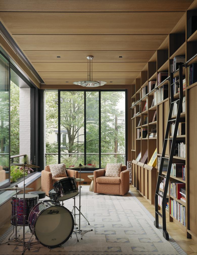 The ground floor serves as the main family zone, with a large kitchen for clients that love to cook and bake at the center. The informal dining and family room open directly to the garden, with the landscape stone extending into the family room to create a seamless indoor/outdoor transition. The piano nobile above serves as the formal entertainment space with a custom library to accommodate a large collection of books. Simple wire-brushed oak punctuates the informal spaces of the house, while smooth fumed oak elevates the more formal spaces.