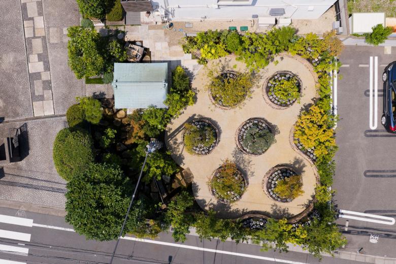 都市部にある寺院の余地は限られている。計画地である墨田区正福寺では駐車場の一部約100m2の敷地に樹木葬として461区画を配置しなければならなかった。樹木葬の基本的な構成は、手前の墓誌+奥の参拝対象としての樹木なので、それが集合したかたちは樹木を中心とする正円が合理的である。その円の直径は樹高2mの根鉢に必要な大きさφ800を中心に、墓石にするφ200程度のごろた石を墓誌が目視できる限界3列で囲み、柵を含めφ2300の島とした。この島を約100m2の敷地に条例で定められた参道幅員1mを確保しながらできる限り多く詰め込まなければならない。ある一定の面積の平面を隙間なく多角形で敷き詰める場合、外周長さを最小化しつつ敷き詰めることができる多角形は「正六角形」であることが数学的に証明されている。正六角形のグリッド上に樹木葬の島を並べることで、参道長さを最小化しつつ墓地区画を最大化することができた。周縁部分の岬状に突き出た部分も区画になっている。各島や岬に配置した献花焼香台は参拝者が背中合わせにならないように互いにずらしてある。
