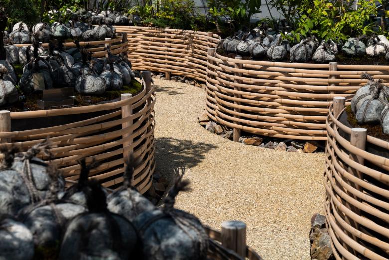 伝統寺院は本来その伽藍配置と付属する庭園や参道、そして結界を暗示する緑地、段差、門、扉、柵、灯籠や手水鉢等添景物を重層化することによって奥行きをつくり、空間的聖域性を維持してきた。都市部にある寺院は都市化による敷地の減少、墓域の拡大によって聖域性を維持するのが難しくなってきている。そこで『想盆』は墓地ではあるが伽藍に付属する回遊式庭園として計画することにした。苔蒸した飛び石のアプローチや縄が架けられた2対の石柱が境内/墓域の結界になり、シュロ縄で十文字に縛られた関守石による墓石が、関守石より上の草木で覆われた「生」の世界/関守石より下のカロート=「死」の世界の結界になり、結界が重層化している。各樹木葬の柵はしなやかで折れにくい竹の力学的特性を利用したしがらみ竹でできていて、傷んだ割竹は随時手入れをし続ける必要がある。しばしば交換したばかりの真緑の割竹が所々まばらに見えることになり、『想盆』はひと時として同じ姿であることはない。