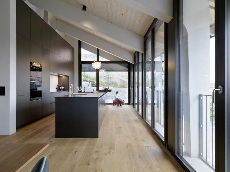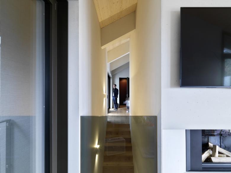 Materialwahl: Bei der Materialwahl wurde auf ausgewählte und langlebige Materialien gesetzt. Für die Fassade des Pavillons wurde weiss eingefärbter Sichtbeton gewählt, der modern und zeitlos wirkt. Der Bauherr war gleichzeitig der Baumeister, alles wurde vor Ort perfekt in höchster Qualität geschalt und betoniert. Im Obergeschoss bestehen alle Aussen- und Innenwände sowie auch die Betonrippen aus Sichtbeton mit Innendämmung, das bestehende Erdgeschoss wurde bereits im klassischen Zweischalenmauerwerk gebaut. Die Fenster bestehen aus hochwertigem Holzmetall. Das Dach ist als Satteldach mit Mineralwollisolierung ausgeführt und mit Natursteinschiefer eingedeckt, während die Untersicht mit sägerohem Fichtentannen verkleidet ist. Im ganzen Haus wurde Eichenparkett im Format Landshausdielen verlegt. Die Kücheneinrichtung und Garderoben sind vom italienischen Hersteller Ernestomeda.