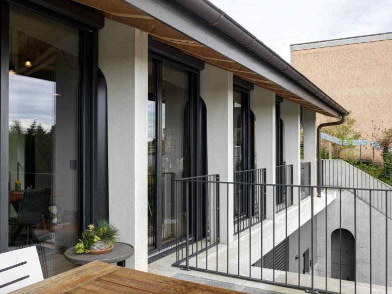 Architektonische Gestaltung: Das Obergeschoss präsentiert sich als Pavillon mit überhöhten Räumen und großflächiger Verglasung, die ein offenes und einladendes Ambiente schaffen. Ein umlaufendes Vordach sowie Erweiterungen zu Terrasse und Sitzplätzen lassen diesen Pavillon schweben und verstärken den Pavillon-Charakter, der sich eingeschossig auf einem Sockel präsentiert und dem Gebäude eine besondere Eleganz verleiht. Das Satteldach mit seiner rustikalen Holzdecke liegt auf Sichtbetonbügeln. Diese zeichnen sich aussen als Rippen oder Stützen ab und rhythmisieren den Innenraum als Träger.