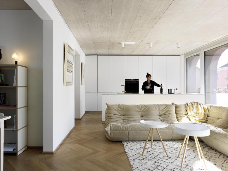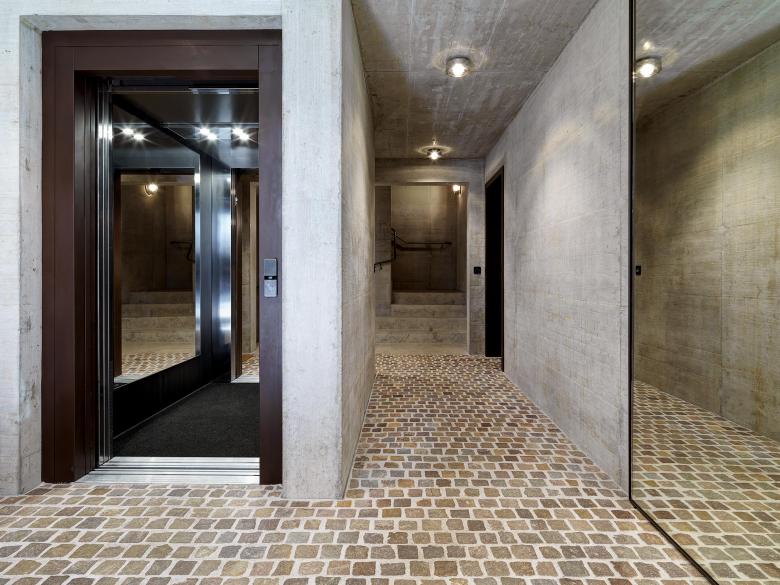 Die rötlich eingefärbte Fassade mit mittig angelegtem Risalit erscheint optisch kürzer und fügt sich harmonisch in den Strassenzug ein. Traditionelle Elemente wie Lisenen und Profile - die im Strassenbild zu finden sind - werden neu interpretiert und verleihen der Fassade Struktur und Tiefe. Zusammen mit den bogenförmigen Fenstern im Attikageschoss sowie einem Satteldach präsentiert sich das Gebäude in seinem Gesamtauftritt als zugleich klassischer und doch zeitgemässer Bau.