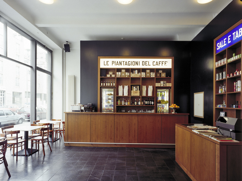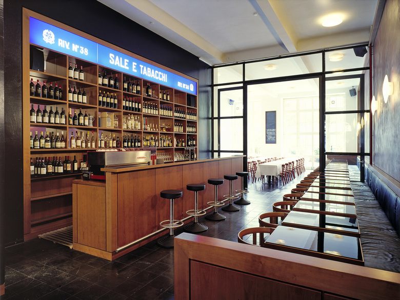 Beim Checkpoint Charly im Presseviertel Berlins liegt das Restaurant „Sale e Tabacchi“ in einem früher als Druckerei genutzten Gründerzeithaus. Durch wenige, akzentuierende Einbauten ist das hohe, langgezogene Erdgeschoss als öffentlicher Ort in der Großstadt inszeniert: Ein hoher Raum, unsentimental, nüchtern, zur Straße mit großen Schaufenstern ausgestattet. Rechts vom Eingang läuft eine rote Wand über die gesamte Gebäudetiefe. Durch eine lange Reihe kreisrunder Wandleuchten wird die Raumtiefe optisch verlängert. Die gegenüberliegende Wand ist schwarz. Sie wird durch hölzerne Regale und Tresen strukturiert. Räumlich und funktional gliedert sich der Gastraum in drei Teile: Das Tagescafé mit den Regalen „Sale e Tabacchi“ und „Le Piantagioni del Caffè“ am Eingang, die Bar in der Mitte und durch eine Glaswand abgetrennt im hinteren Teil das Restaurant, welches sich im Sommer in den Hof hinein erweitert.