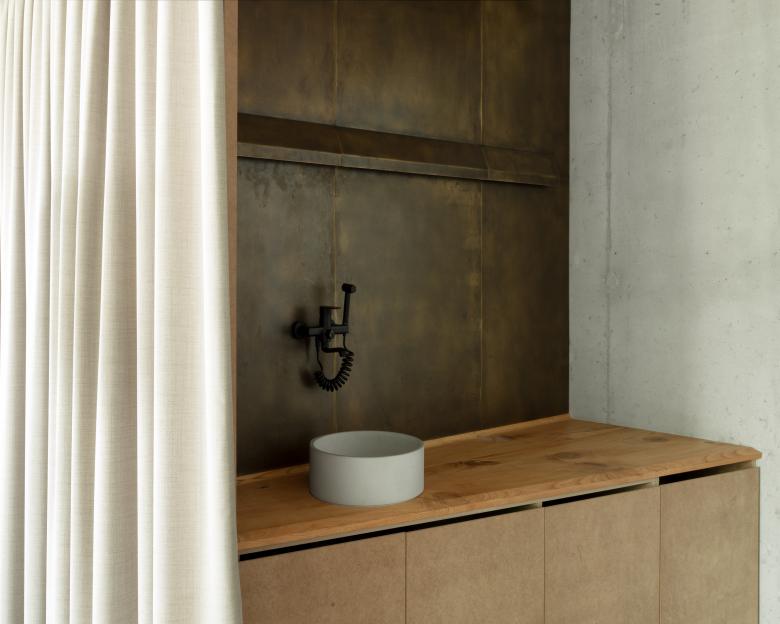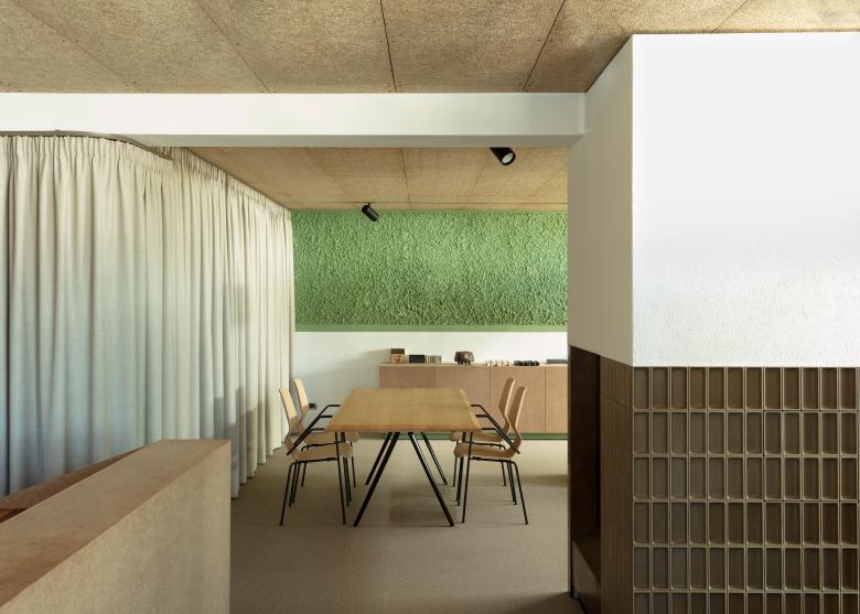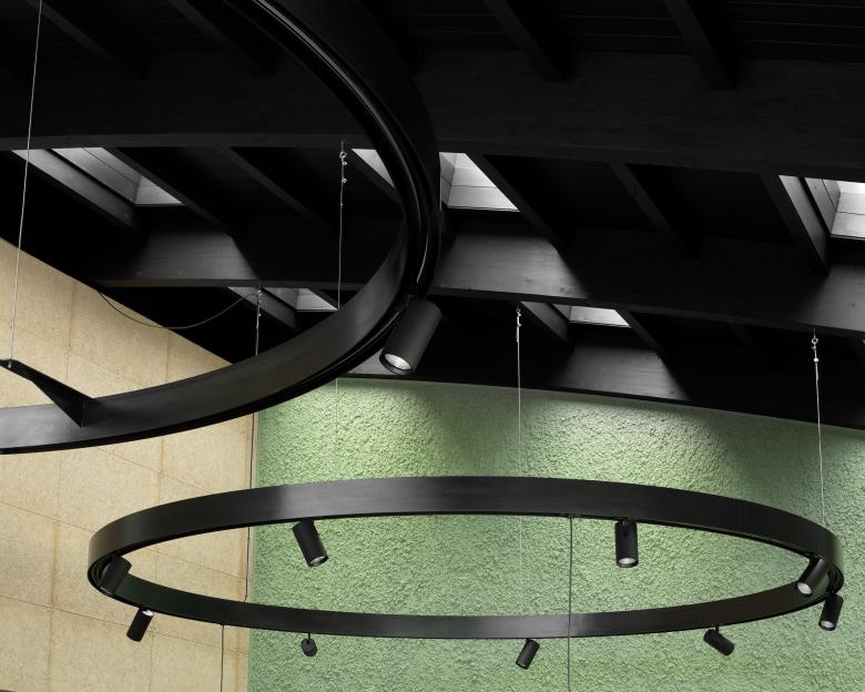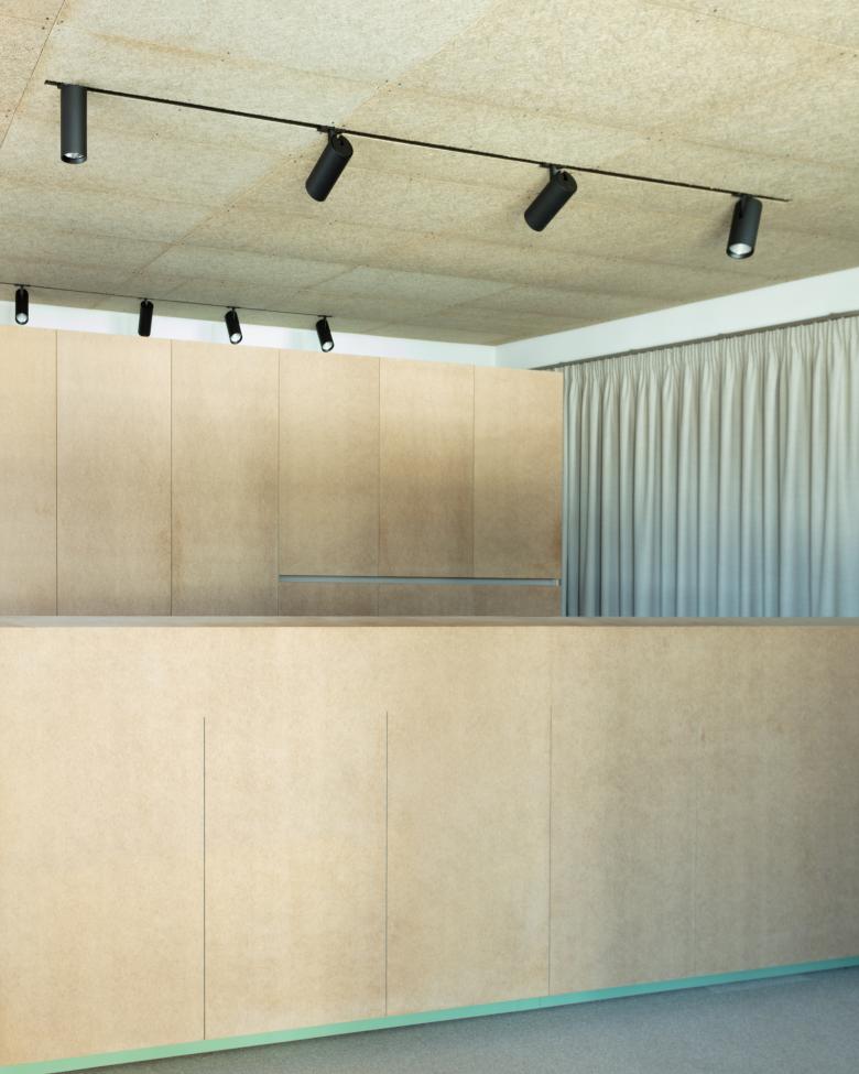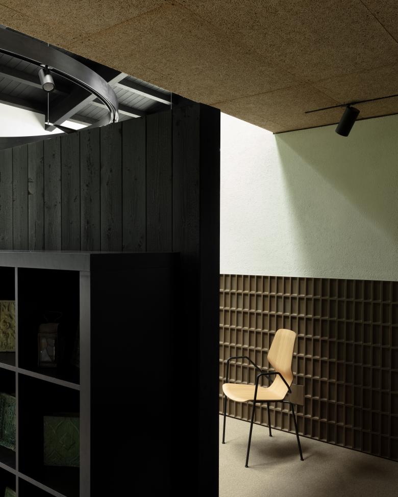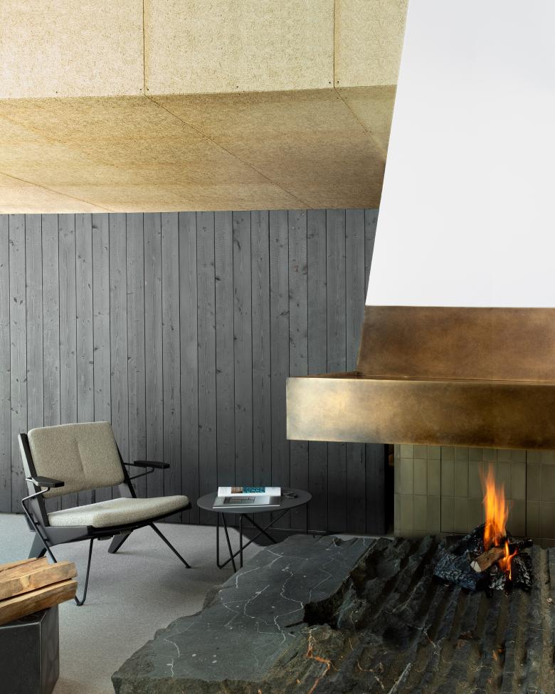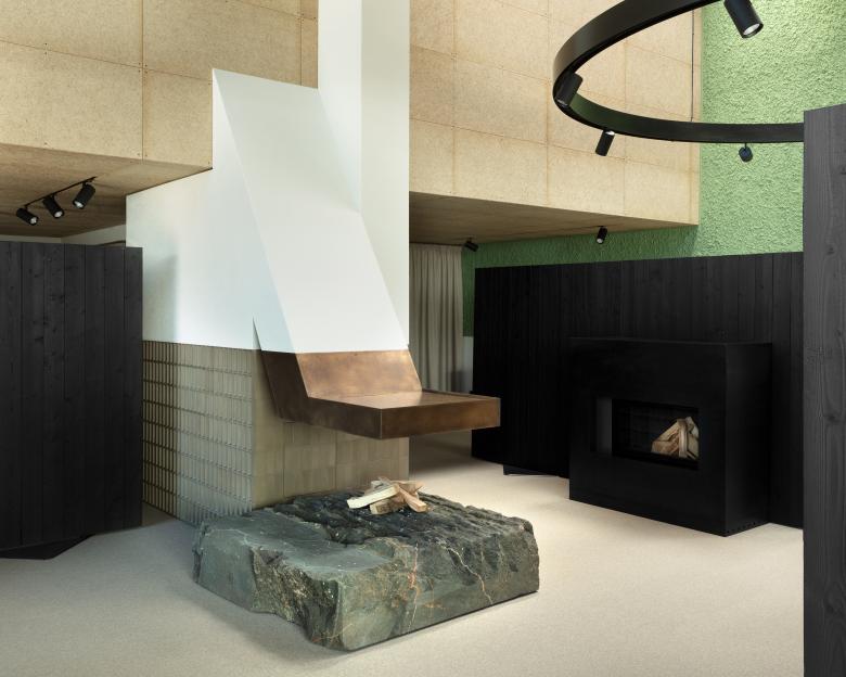 An ashen-colored carpeting, oiled MDF furniture, Heraklith ceiling and wall panels, a coarse green plaster and an interior roof structure painted in black elicit forever archaic motifs associated with fire. Suspended below the vaulted roof, two metal rings – painted black – illuminate the showroom, eliciting the cozy atmosphere of an open fireplace. The brass used for the logo, the exhaustion hood and the bar nook creates subtly glistening highlights.