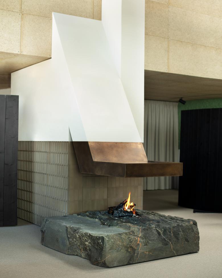 An open hearth – gathering site to mankind since the beginning of time - stands at the center of the showroom, becoming its essential element. Four charred wooden stage walls laid-out orthogonally around the fireplace form the backdrop for the displays of stoves and tiles. In their midst, sits complacently heavy the hearth’s monolith rock – whispering tales of times long past – almost unprocessed, primal and raw. Rising above, the exhaust hood waits patiently its turn only to surrender to the chimney.