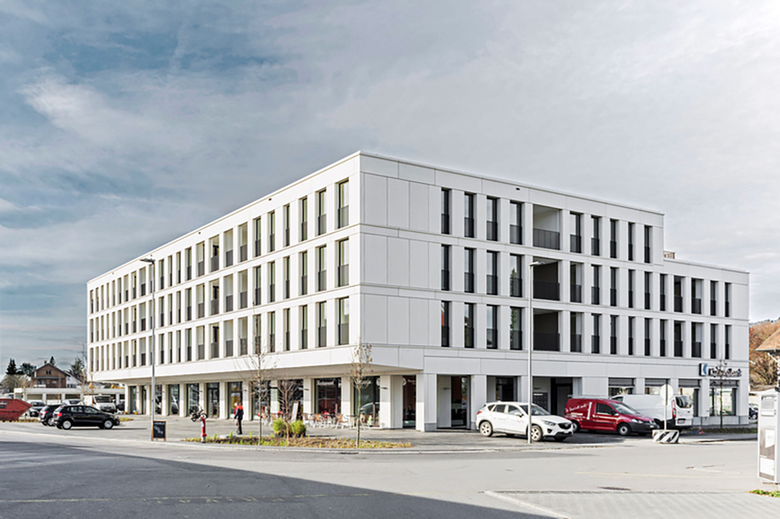 Während die Gewerbeflächen mit 1’100 m2 NF das gesamte Erdgeschoss einnehmen, gruppieren sich die 36 Wohnungen in den Obergeschossen um einen Innenhof und werden zum grossen Teil auch von dort erschlossen.