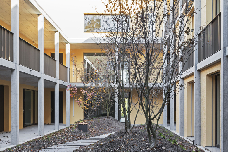 Der Innenhof ist als «Oase» gedacht – hier öffnet sich, abseits vom lebendigen Betrieb am Bahnhof und der lärmbelasteten Bernstrasse, eine andere, ruhige Welt. Das Haus entspricht dem Minergie-Standard und alle Wohnungen sind mit einer kontrollierten Wohnungslüftung ausgestattet.