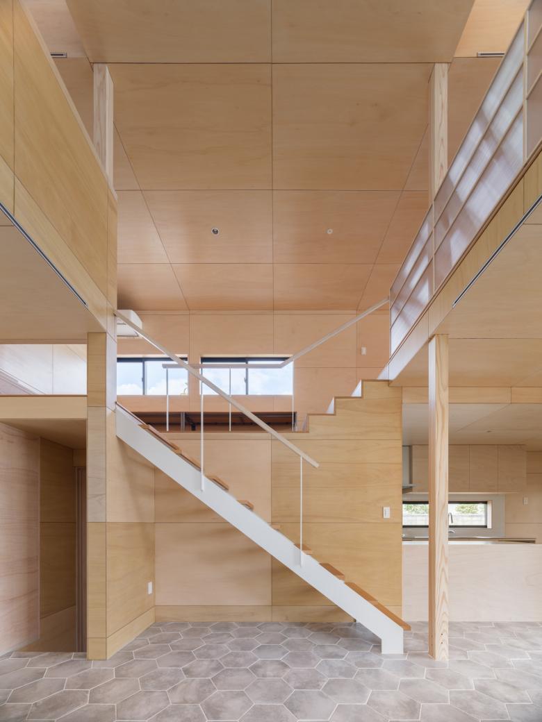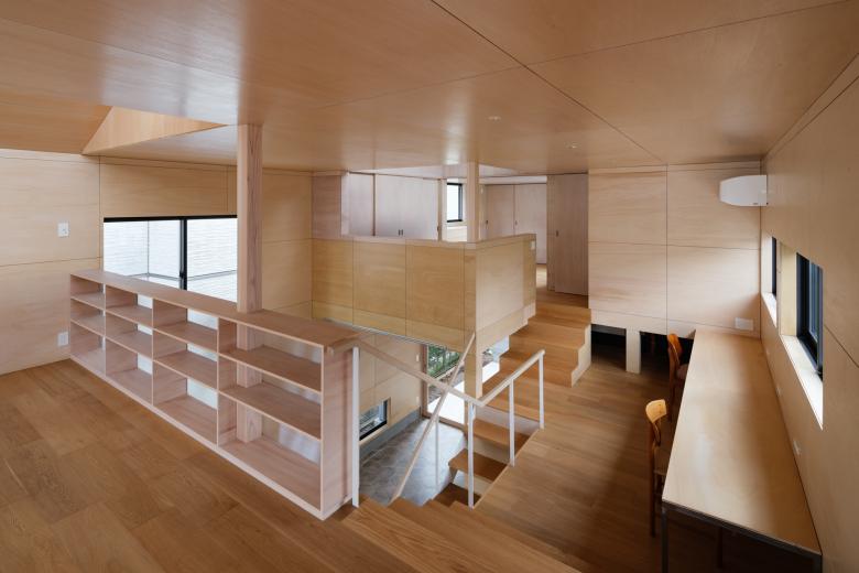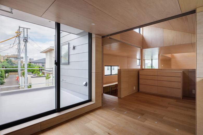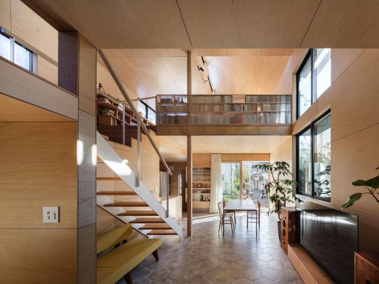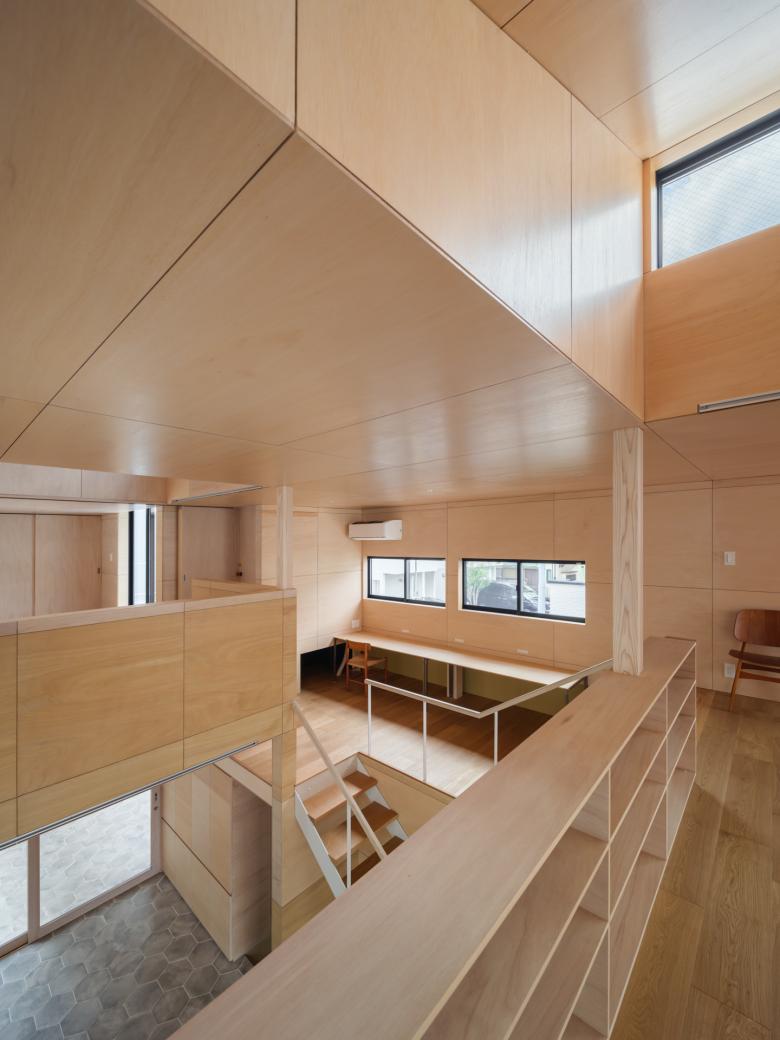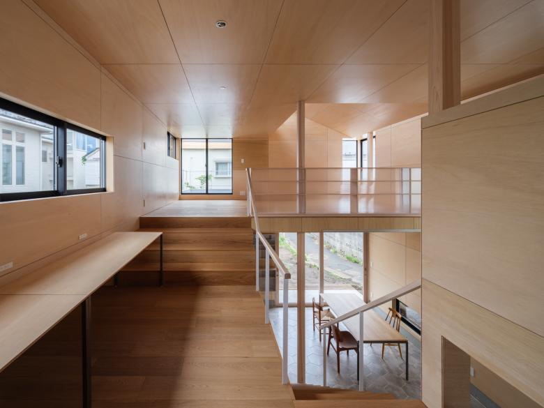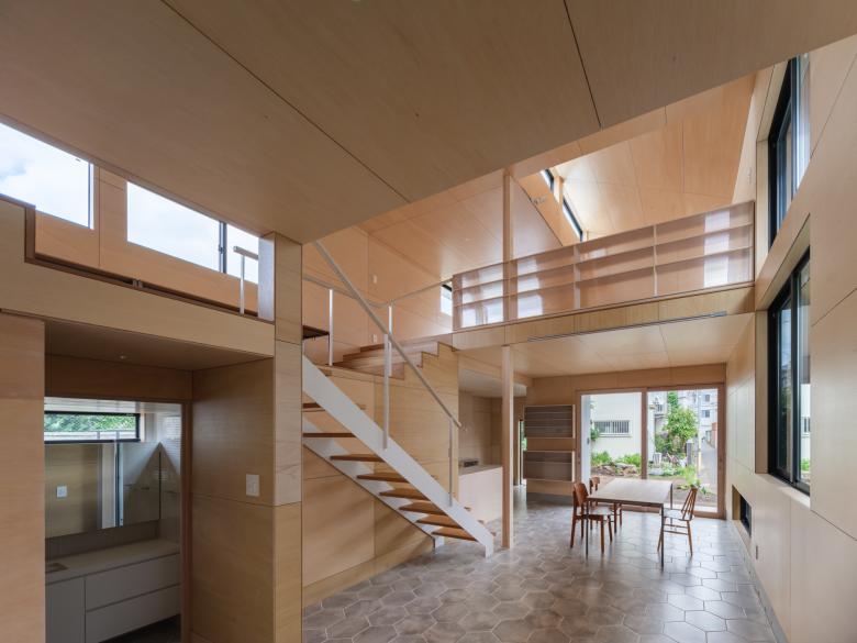 1階はポーチから連続する土間としてふたつの道を繋ぐ。幅1間半の開口部は道幅を参照した。内部は吹抜けも含めて天井高さをできるだけ高くして多方向から1階に光が落ちるようにすることで、路上を想起させる外部的な環境をつくっている。また、高度斜線がかかる北側の軒高を下げるため、1階水回り部分を掘り下げて中2階の床をつくり、そこから吹抜けに面して東西に2階の床を配置する、ほぼワンルームの構成とした。2階でもそれぞれの道の端部に正対するように窓を開けることで、稠密に建て込んだ低層住宅地にもかかわらず、ずっと向こう側まで視線が抜ける。それらの窓を介して、道に沿って吹いてくる風もそのまま内部を通って抜けていく。いろいろな虫も飛んで通り抜けていく。