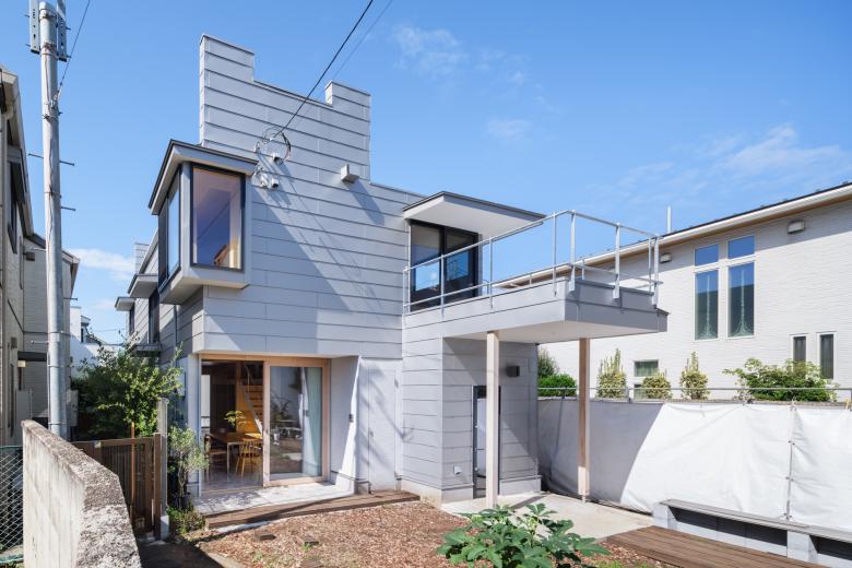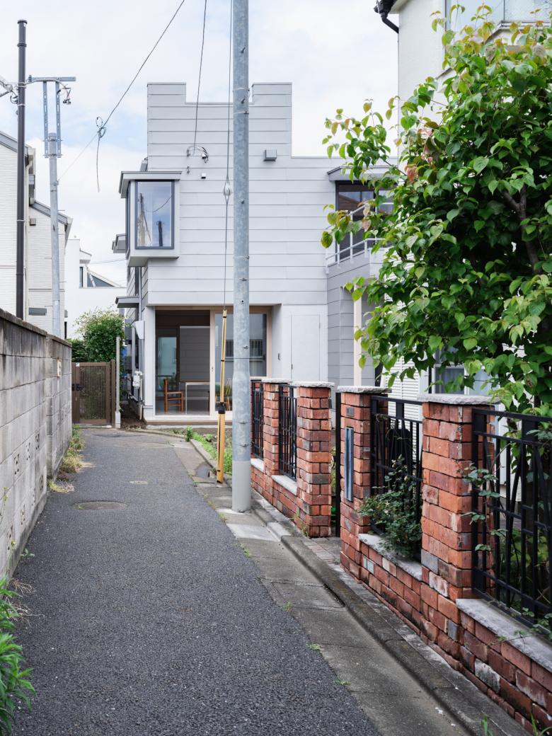 設計者の自宅である。戦後に妻の祖父が曽祖父から受け継いだ大きな敷地は、70年代に東西に分筆され、東の敷地に大ぶりな2世帯住宅を建てて祖父母が暮らしていた。彼らが亡くなった後、私たち家族がその家で7年ほど暮らした。敷地が北と東の2項道路の突き当たりに位置し、南側を空けて家が建っていたことから、私有地にもかかわらず軒先の庭をご近所さんが通り抜けの道として利用していた。その後、相続対策で2度目の分筆をして自宅を建てることとなった。敷地が引き続きふたつの道の突き当たりとなるような分筆のラインをデザインし、かつての通り抜けがそのまま残るように、道に架構を被せるイメージで住宅を配置した。