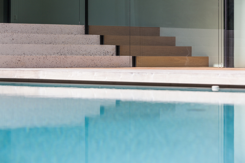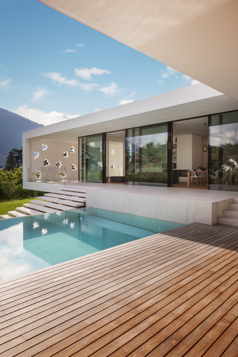 Le zone giorno si affacciano su una spaziosa terrazza e la piscina. Una scala galleggiante porta al giardino.