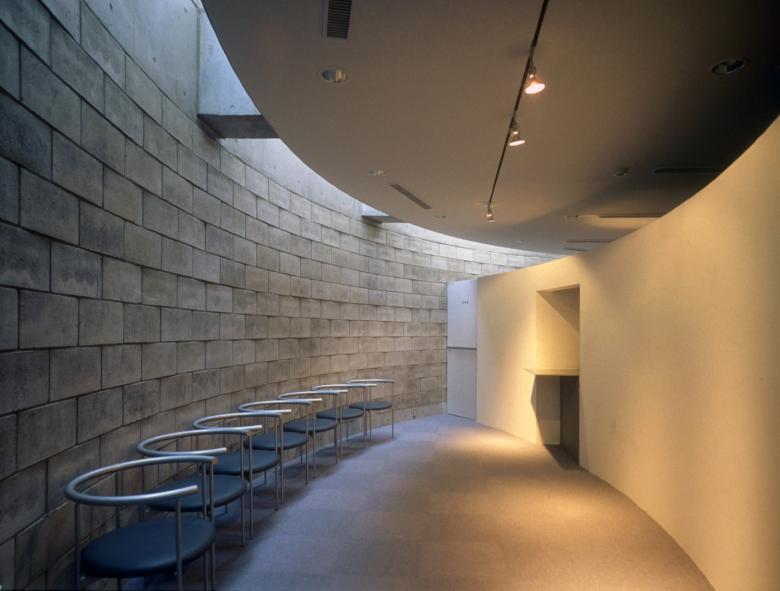 The building takes the form of a semi-cylindrical cylinder constructed from thick concrete, creating an abstract and powerful expression. Natural light streams into the consultation rooms and waiting area in the basement through skylights encircling the cylinder, creating a calm and bright space. A courtyard is situated at the centre of the second and third floors, which serve as residential quarters, delivering soft light to the main rooms. Furthermore, through the glass blocks and slits regularly dotted across the exterior walls of the cylinder, flickering light and strong, linear light continuously impart a fresh character to the interior spaces as the sun moves across the sky. Additionally, light passing through the prism glass in the courtyard creates a serene, underwater-like atmosphere in the hall below. The aim of the project was to create a building that, in response to the adverse external environment characterised by noise, vibration and exhaust fumes, uses the power of the ever-changing sunlight to liberate the interior space from these constraints and transform it into a richly evocative space suited to each specific area.