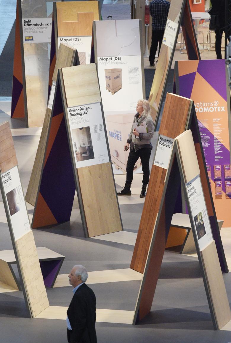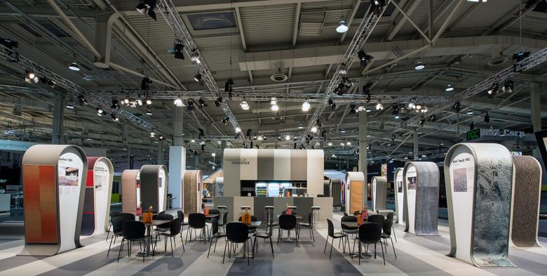 Für die Displays der handgeknüpften Teppiche wird das Thema des Webens und des Webstuhls herangezogen und mit elegant aufgebogenen Flächen kombiniert. Jeder Teppich kann so gut aus der Ferne und von nahem begutachtet werden. An passenden Stellen verwandeln sich die gebogenen Flächen in Sitzgelegenheiten oder Schautafeln.