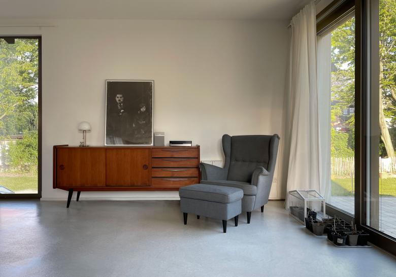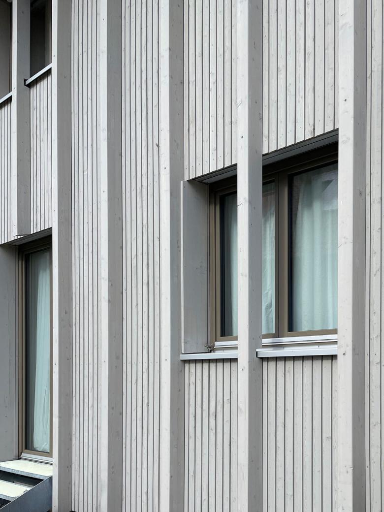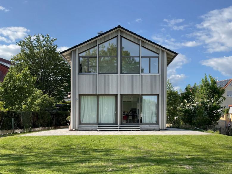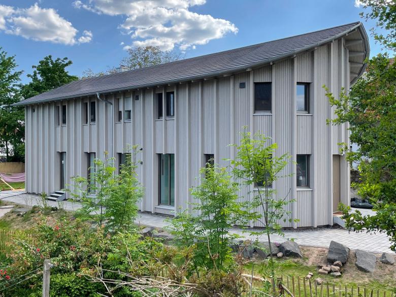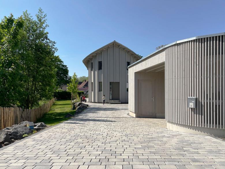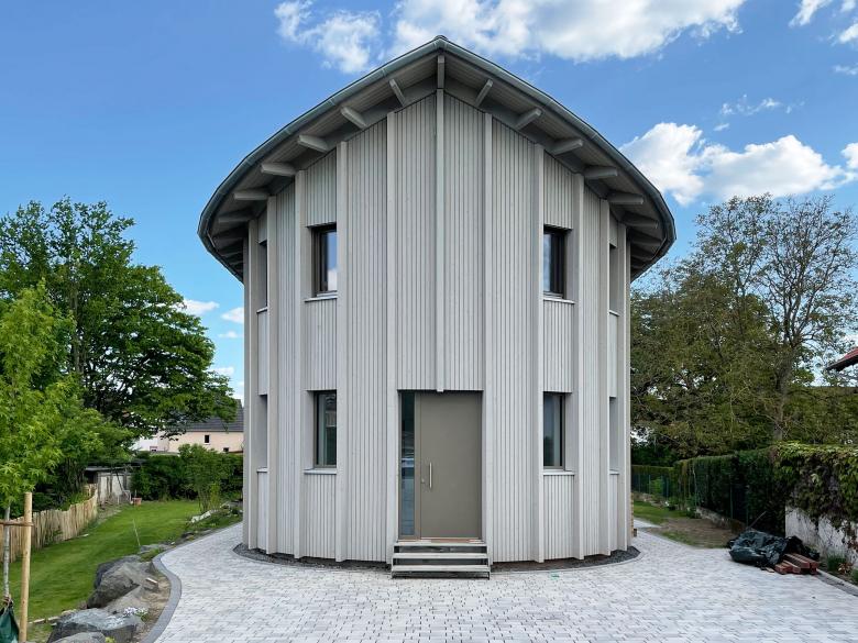 Das Wohnhaus in Holzmassivbauweise passt sich einem langgestreckten Grundstück an, die Rundung im Norden ist dabei das Ergebnis des nach Norden enger werdenden Baufeldes. Die Fassade ist mit Kanthölzern strukturiert, in die sich die Fenster und Öffnungen einpassen.