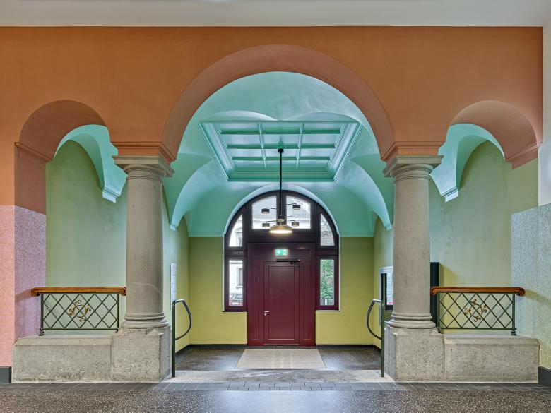 Die heute das Innere prägenden Umbauarbeiten der 70er Jahre zeichnen sich nicht nur durch eine für den Späthistorismus und das Gebäude von Gustav Gull fremde architektonische Formensprache und Materialisierung aus, sondern rauben der Korridorsituation auch auf unverständliche Art und Weise die innenräumlichen Qualitäten: Die grosszügige seitliche Belichtung des Korridors ist durch den muralen Einbau eines zusätzlichen Unterrichtsraums von diesem abgetrennt und hat somit prekäre Belichtungsmomente zur Folge. Unser Vorschlag beabsichtigt daher, in erster Linie die damalige Raumkonzeption des Korridorbereichs wiederherzustellen, in dem die Öffnung zur Befensterung an der Fassade rekonstruiert wird. Gleichzeitig soll sich die ursprünglich formal stark ausgezeichnete Mittelzone mit der Erschliessung und den Sanitärkernen wieder in einer vom restlichen Erschliessungsbereich differenzierten Materialität und Formgebung abzeichnen. Ob dies in ihrer ursprünglichen Ausformulierung möglich sein wird, werden Sondagen zeigen müssen, ansonsten kann diese Stärkung auch mit neuzeitlichen Mitteln, z.B. glänzenden, keramischen Wandplatten, wie sie z.B. beim Brunnenelement vorhanden waren, erfolgen.