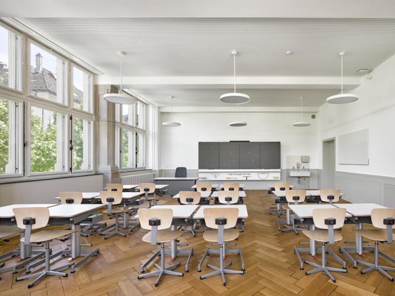 Um dennoch räumliche Trennungen zur Bildung von Gruppenräumen artikulieren zu können werden raumhohe strukturelle Verglasungen mit Holzrahmen eingesetzt, welche sich der originalen Raumkonzeption unterordnen. Die Unterteilungen können auf unterschiedliche Arten stattfinden: Es können kleinere, von den Zugangssituationen der Unterrichtszimmer unabhängige Gruppenräume abgetrennt werden oder, je nach pädagogischen Bedürfnissen, werden Clustereinheiten ausgezeichnet, welche übergeordnete Raumeinheiten zusammenfassen könnten. Diese Raumkonzeption stärkt wiederum die ursprünglich von Gustav Gull konzipierte Raumabfolge, welche von der klar formulierten Mittelzone ausgeht. Auf Grund der neuen Brandschutznormen ist dies problemlos möglich.